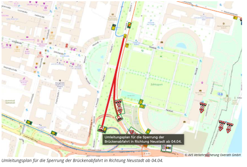 Es kommt  im Zuge der Sperrung der Brückenabfahrt Neustadt ab dem 4. April zu Umleitungen für den Kfz-, Rad- und Fußverkehr. Bezüglich der Umleitungsstrecke für den Rad- und Fußverkehr kam es nun zu einer kurzfristigen Änderung.